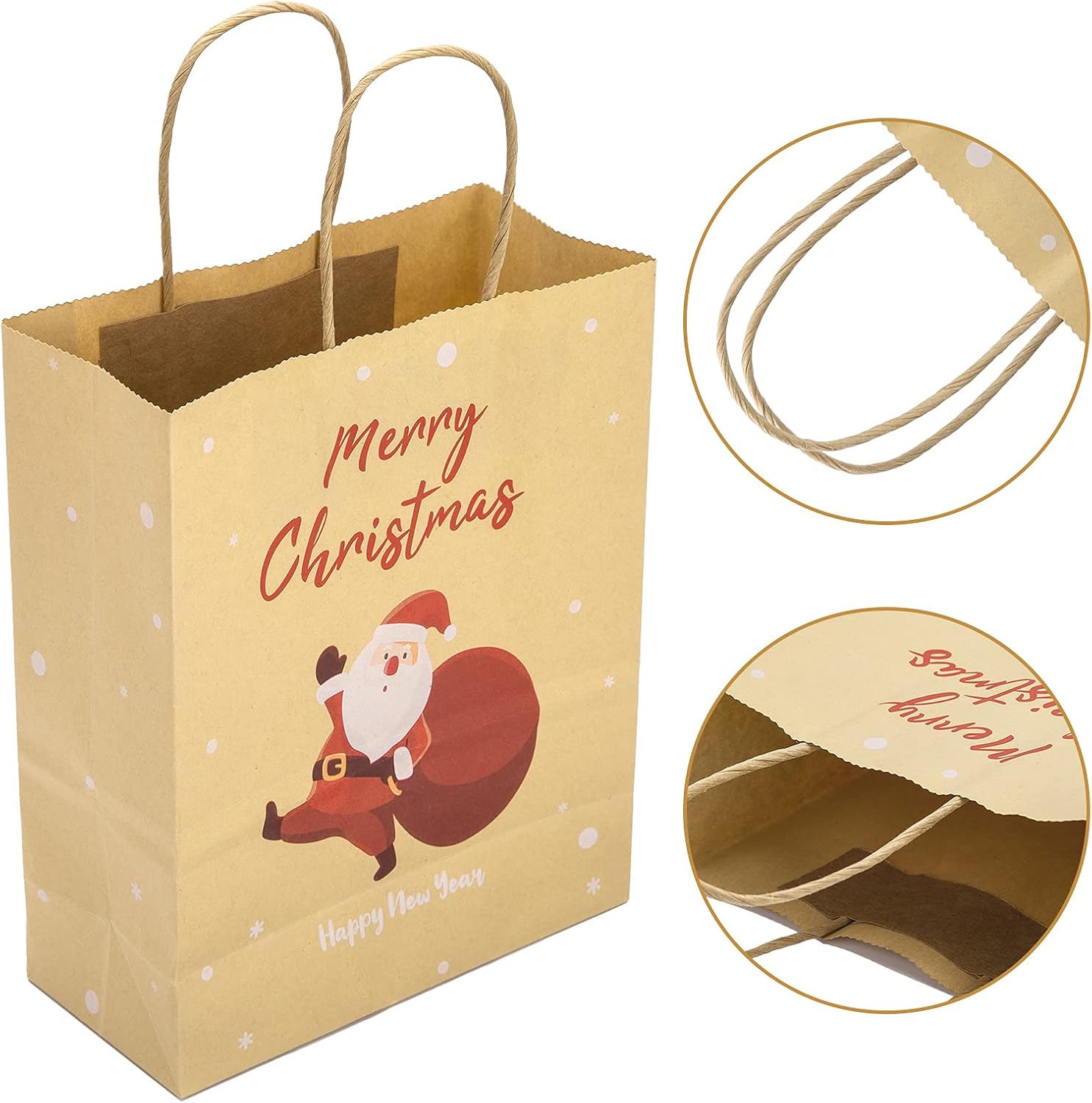 Our packaging bags are made of environmentally friendly thick kraft paper, printed with classic and simple Christmas elements, not easy to break, and can be used repeatedly. The twisted paper carry handle is strong and unbreakable.