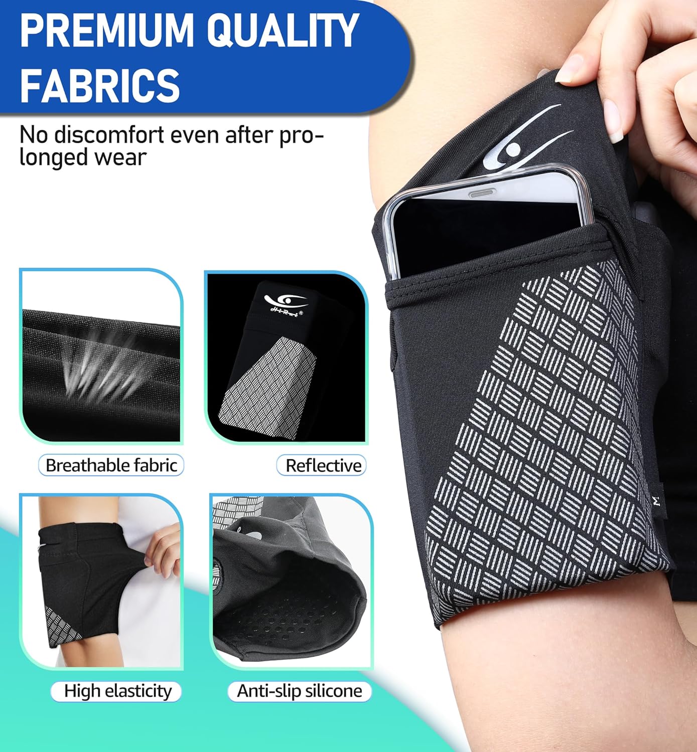 Crafted from high-elastic, breathable Lycra, this lightweight and snug armband ensures maximum comfort without any irritation.Featuring a convenient storage compartment for your phone and cards, two side pockets for keys and cash.